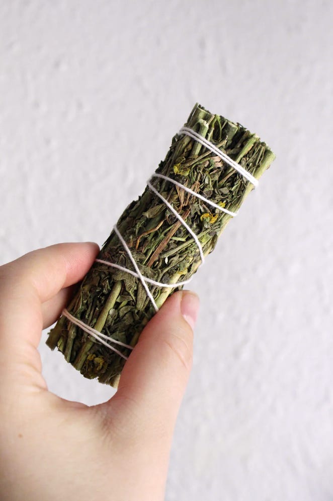 But it isn’t only botanicals that were burned as a means of cleansing, protecting, and fumigating. Documented in the writings of Eastern European Ashkenazim, we see the collecting of cobwebs for warding off fright. In this practice, one could burn cobwebs from four corners.³ Other examples include “earth from beneath three thresholds, a splinter from the threshold of a synagogue, the front hooves of a goat, a ‘devil’s finger’ (fossilized belemnite), an umbilical cord—which would have been kept and dried for this very purpose—and herbs used in incense intended for protection from demons”³