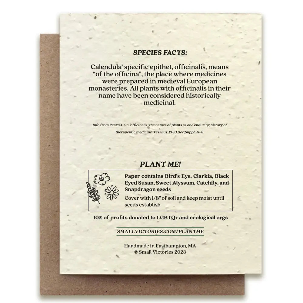 These greeting cards feature our original illustration of the medicinal plant calendula (Calendula officinalis). They are printed on cream-colored seeded paper made from post-consumer waste. Embedded in this plantable paper is a mix of wildflower seeds: bird’s eye, clarkia, black-eyed Susan, sweet alyssum, catchfly, and snapdragon. - A2 Size/ 4.25 x 5.5 in / 10.8 x 14 cm - Recycled kraft envelopes included - Folded & blank inside - Planting instructions & seed list on back - 2 year shelf life - Non-GMO seeds considered safe & non-invasive for USA, Canada, & EU planting 10% of profits are donated to LGBTQ+ and ecological orgs. To plant, cover with 1/8” of soil in full/partial sun and keep moist until seeds establish.