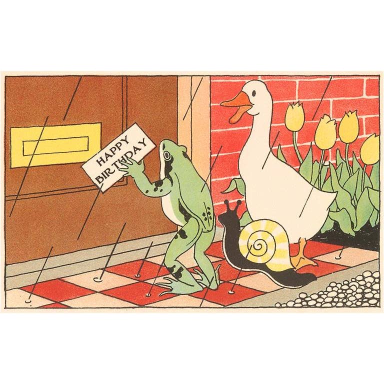 Postcard HB-204 Happy Birthday, Frog, Duck and Snail. This is a Postcard 3.5" x 5.5" featuring an image from our Happy Birthday collection titled Happy Birthday, Frog, Duck and Snail.