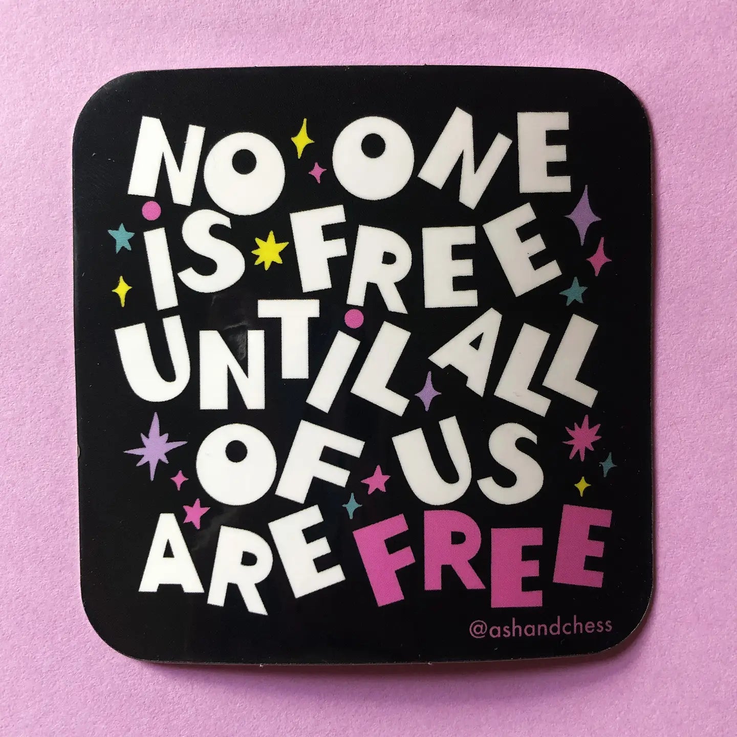 Our 'No One Is Free' sticker is a striking 3" x 3" vinyl piece from Ash + Chess. This design reflects our commitment to creating stationery and gifts that uplift and resonate with the queer community. Perfect for personalizing laptops, notebooks, phone cases, and more. Let it stand as a bold statement on your everyday items, a true embodiment of our brand's ethos. Ash + Chess is proud to bring you this unique piece, designed with passion and purpose in Kingston, NY.