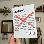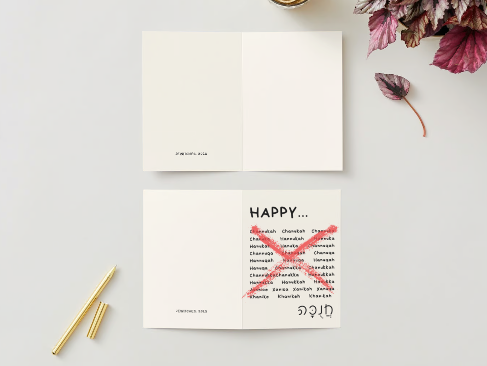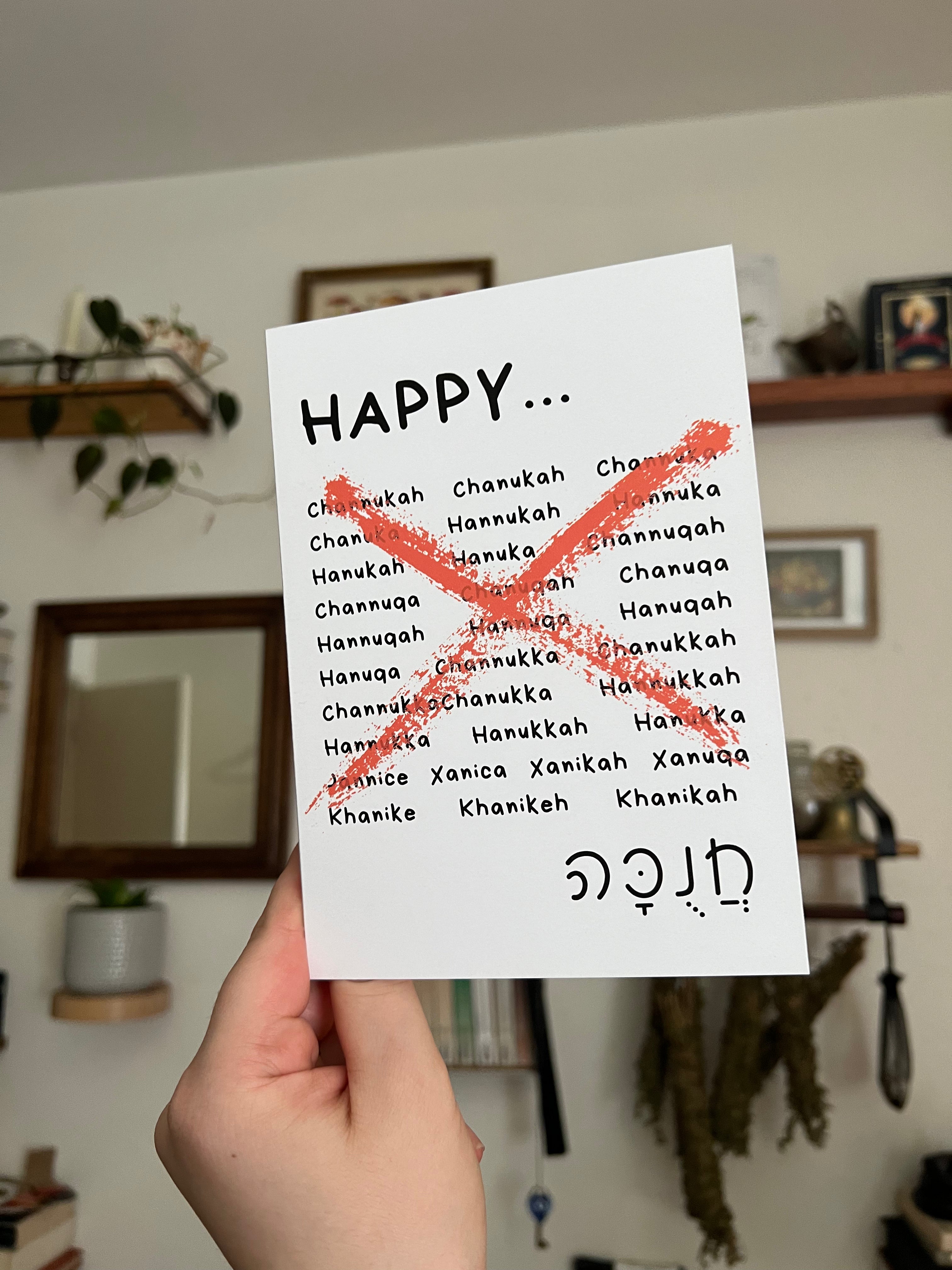 Celebrate 8 days of spelling fun with this 'Happy...Channukah' greeting card! Featuring every creative spelling of the word Hannukah, this card has an plain inside to give you room to pick your spelling favorites!
